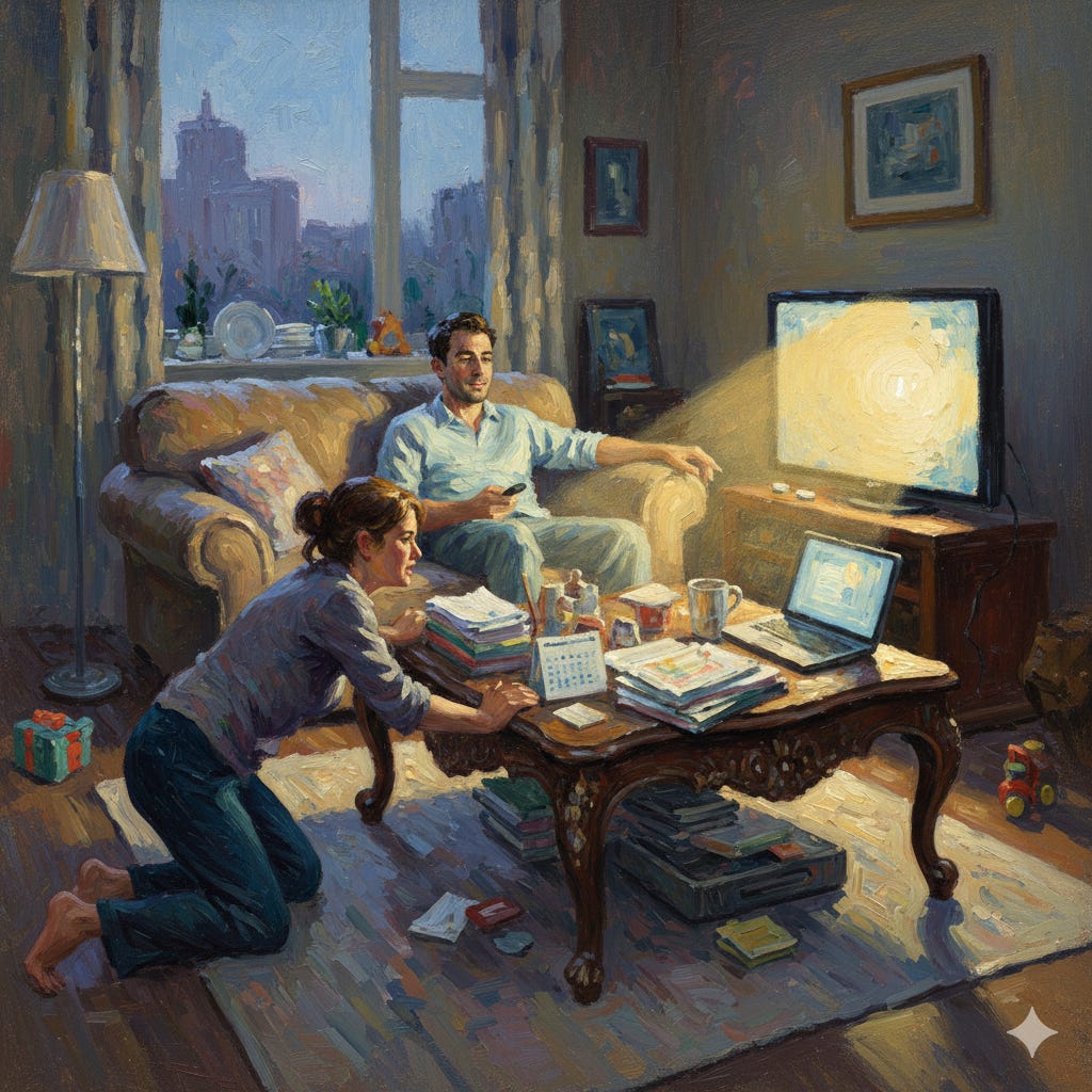Beyond the visible labor, the Committed Partner assumes the entire cognitive load; the constant, exhausting mental inventory of needs, appointments, future planning, emotional temperatures, and crisis contingency that keeps the family machine humming. This is the CEO of the home, whose meticulous planning, proactive problem-solving, and emotional bandwidth are never salaried, rarely praised, and therefore, often unseen. Their effort is a high-quality, sustained investment, made out of deep commitment, functioning as the primary emotional shock absorber for the entire unit, managing not only their own anxieties but often pre-emptively regulating the partner’s moods and responses. This unceasing mental and emotional vigilance leads to a state of chronic exhaustion, known as decision fatigue, where the simple act of choosing what to make for dinner can feel like an overwhelming burden.
